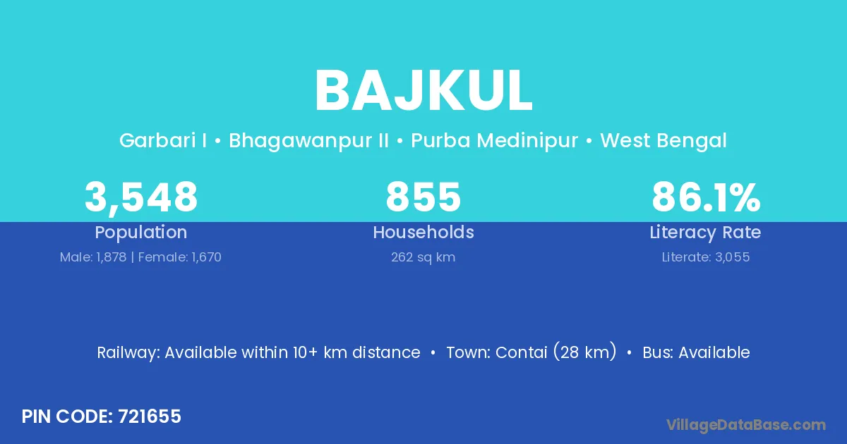 Contai (28 km) is the nearest town to Bajkul village for major economic activities and is located approximately 28 km away.