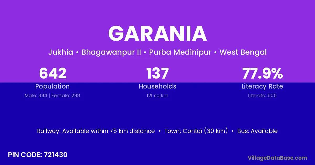 Contai (30 km) is the nearest town to Garania village for major economic activities and is located approximately 30 km away.