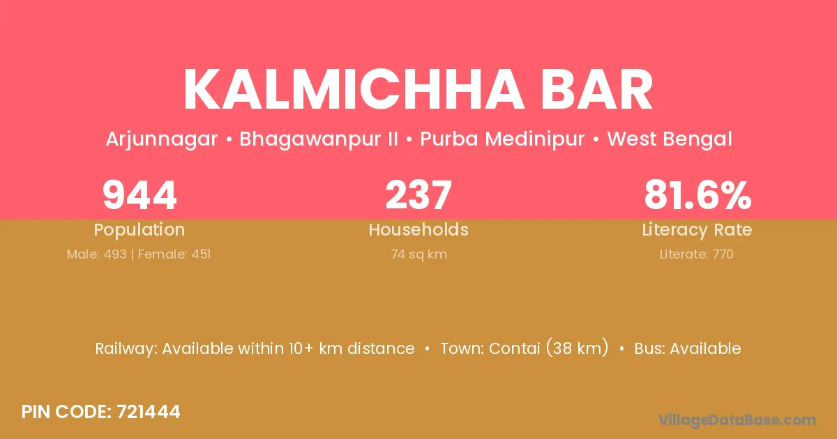 Contai (38 km) is the nearest town to Kalmichha Bar village for major economic activities and is located approximately 38 km away.