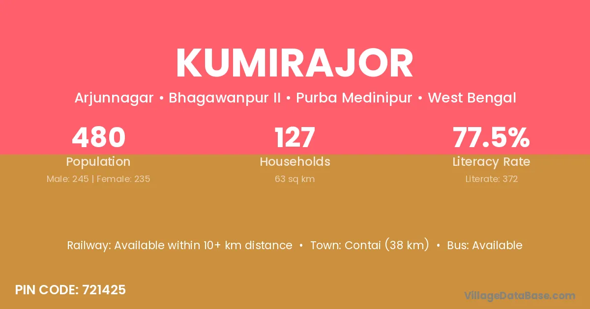 Contai (38 km) is the nearest town to Kumirajor village for major economic activities and is located approximately 38 km away.
