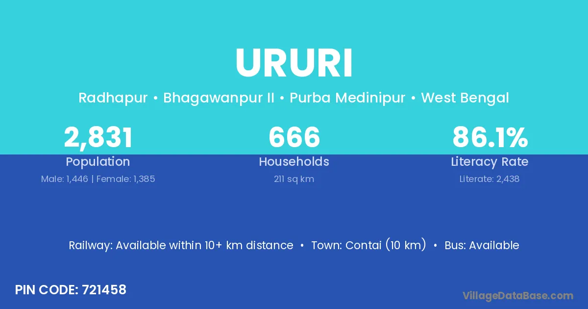 Contai (10 km) is the nearest town to Ururi village for major economic activities and is located approximately 10 km away.