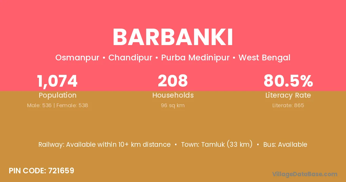 Tamluk (33 km) is the nearest town to Barbanki village for major economic activities and is located approximately 33 km away.