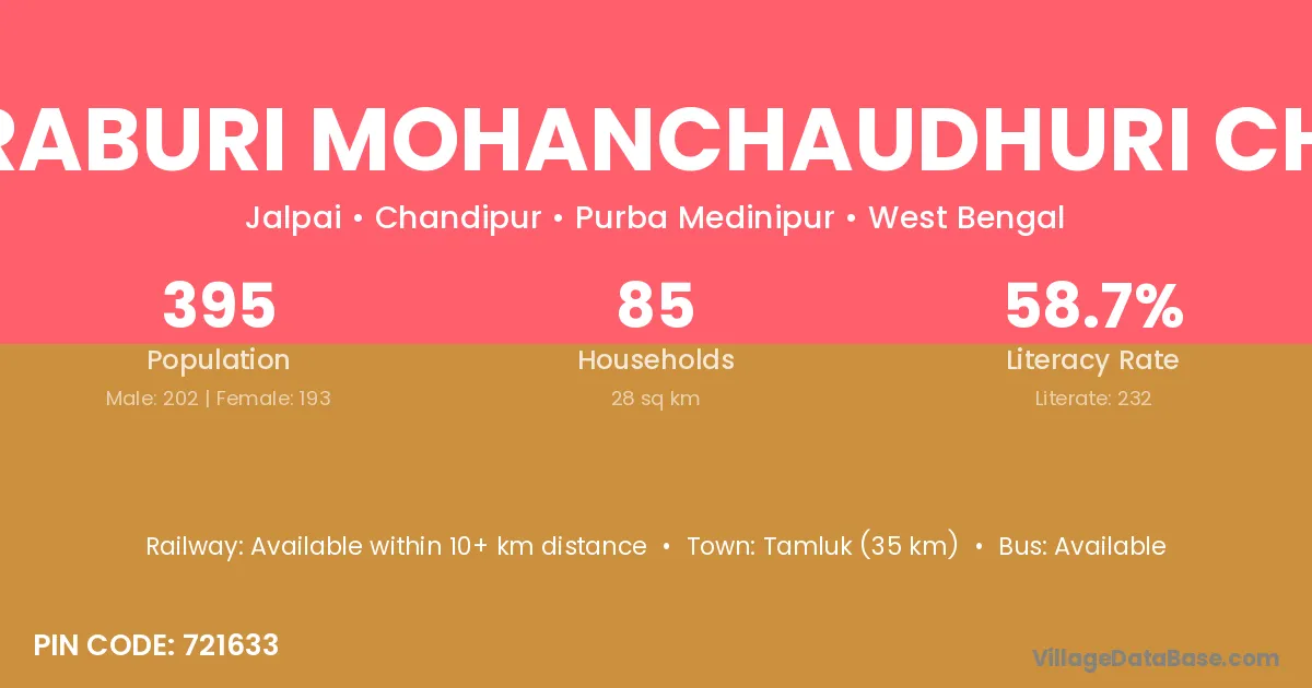 Tamluk (35 km) is the nearest town to Buraburi Mohanchaudhuri Chak village for major economic activities and is located approximately 35 km away.