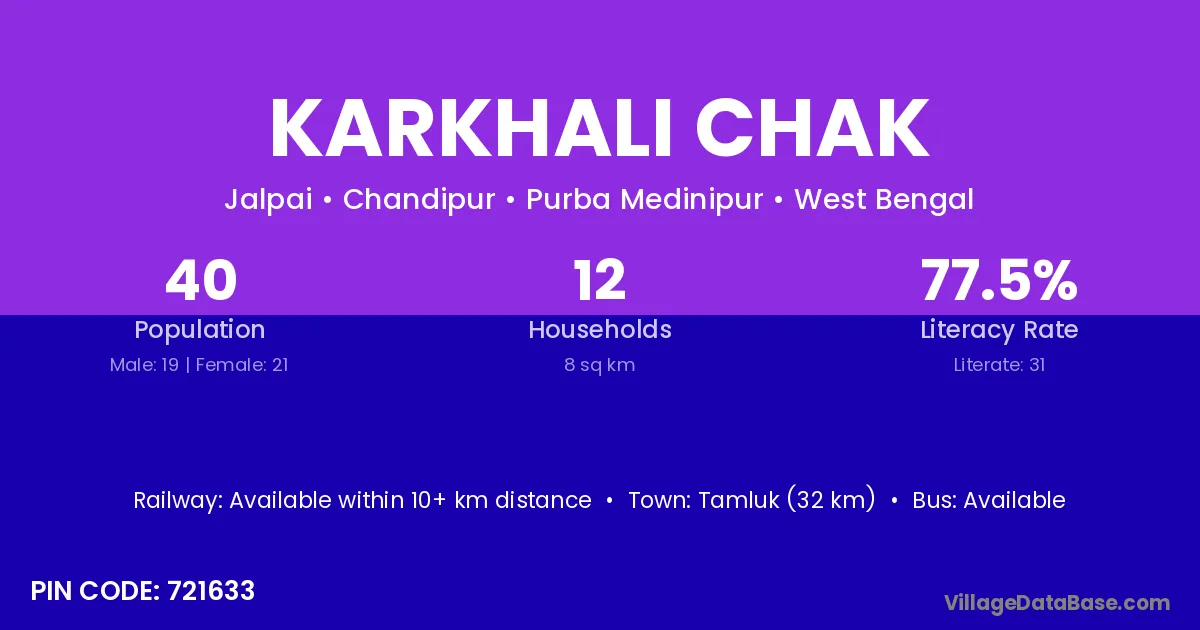 Tamluk (32 km) is the nearest town to Karkhali Chak village for major economic activities and is located approximately 32 km away.