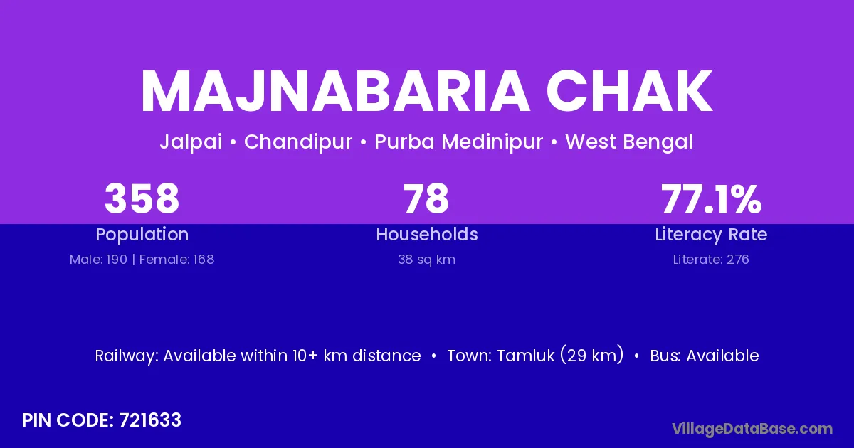 Tamluk (29 km) is the nearest town to Majnabaria Chak village for major economic activities and is located approximately 29 km away.