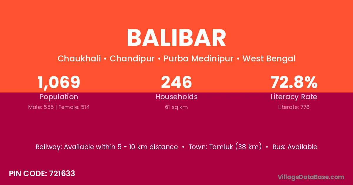Tamluk (38 km) is the nearest town to Balibar village for major economic activities and is located approximately 38 km away.