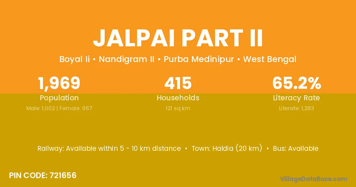 Tamluk (10 km) is the nearest town to Jalpai Part Ii village for major economic activities and is located approximately 10 km away.