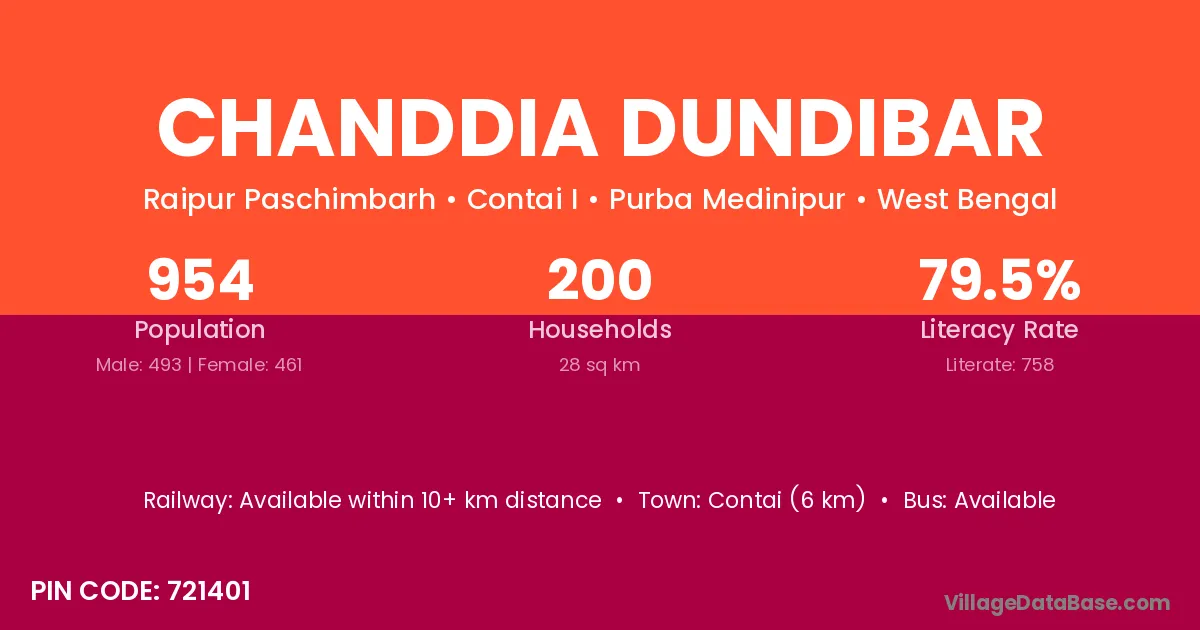Contai (6 km) is the nearest town to Chanddia Dundibar village for major economic activities and is located approximately 6 km away.
