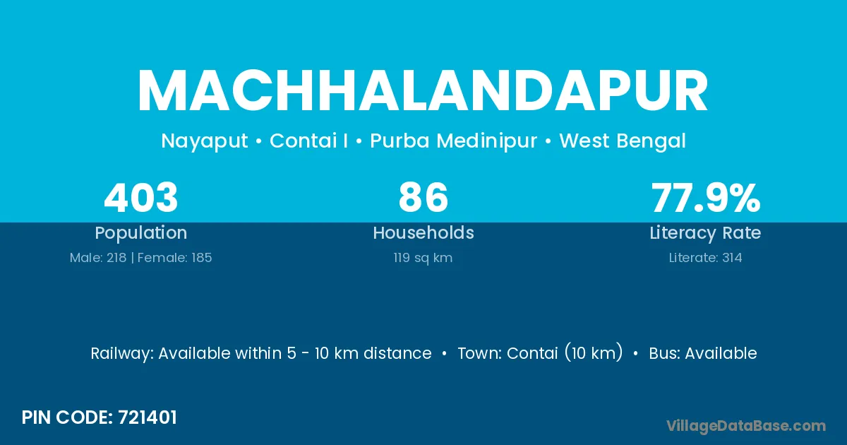 Contai (10 km) is the nearest town to Machhalandapur village for major economic activities and is located approximately 10 km away.