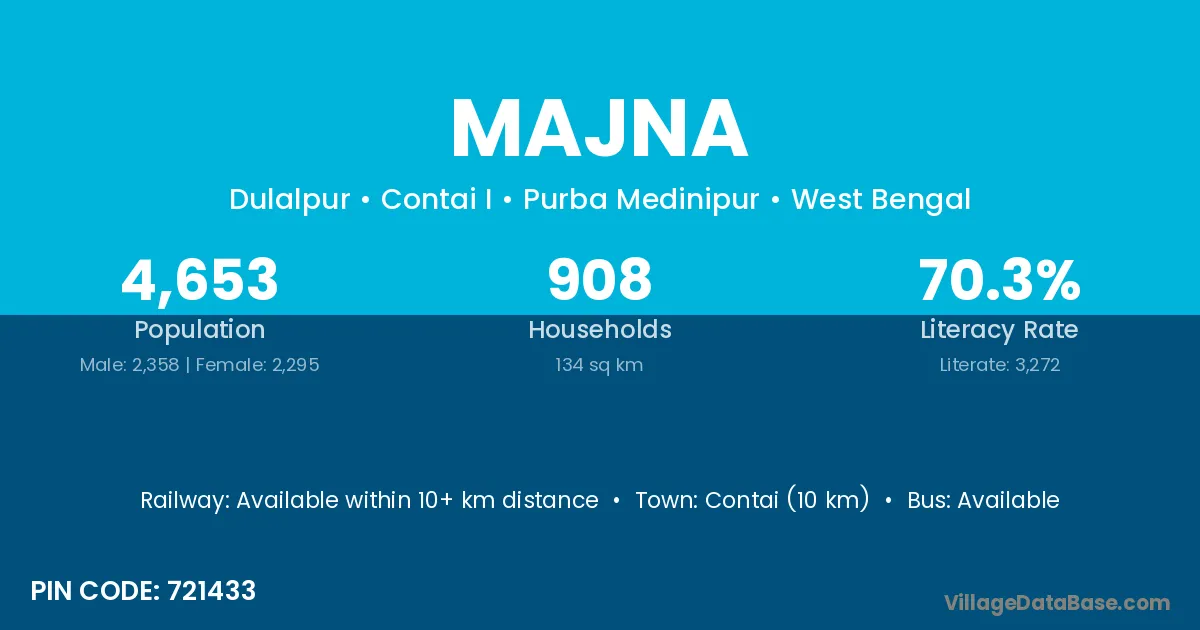 Contai (10 km) is the nearest town to Majna village for major economic activities and is located approximately 10 km away.