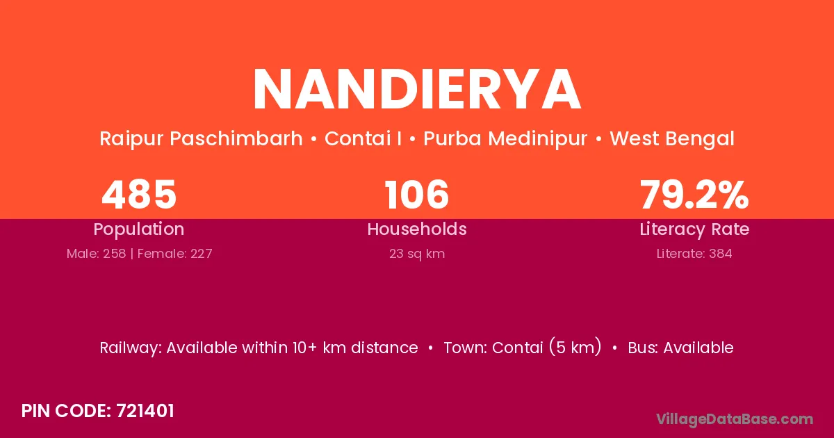 Contai (5 km) is the nearest town to Nandierya village for major economic activities and is located approximately 5 km away.