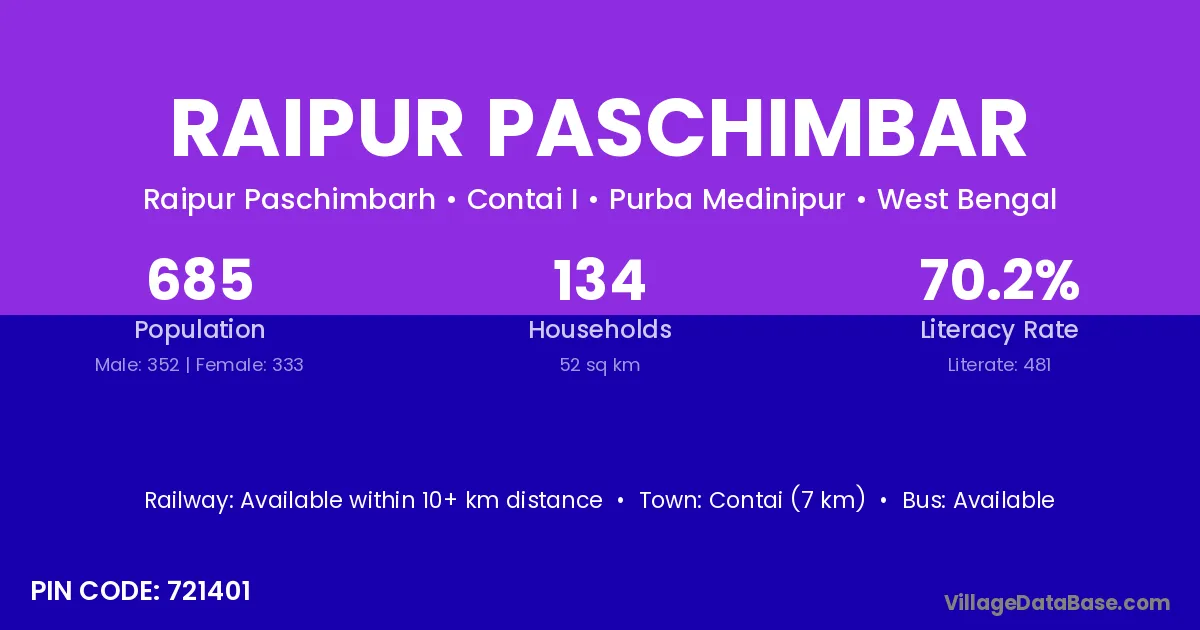 Contai (7 km) is the nearest town to Raipur Paschimbar village for major economic activities and is located approximately 7 km away.