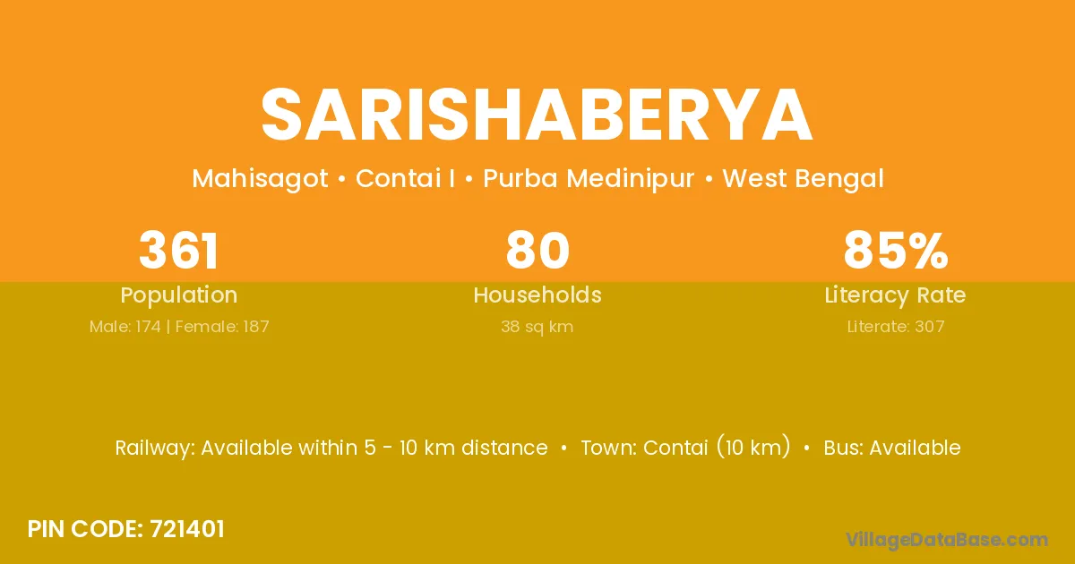 Contai (10 km) is the nearest town to Sarishaberya village for major economic activities and is located approximately 10 km away.