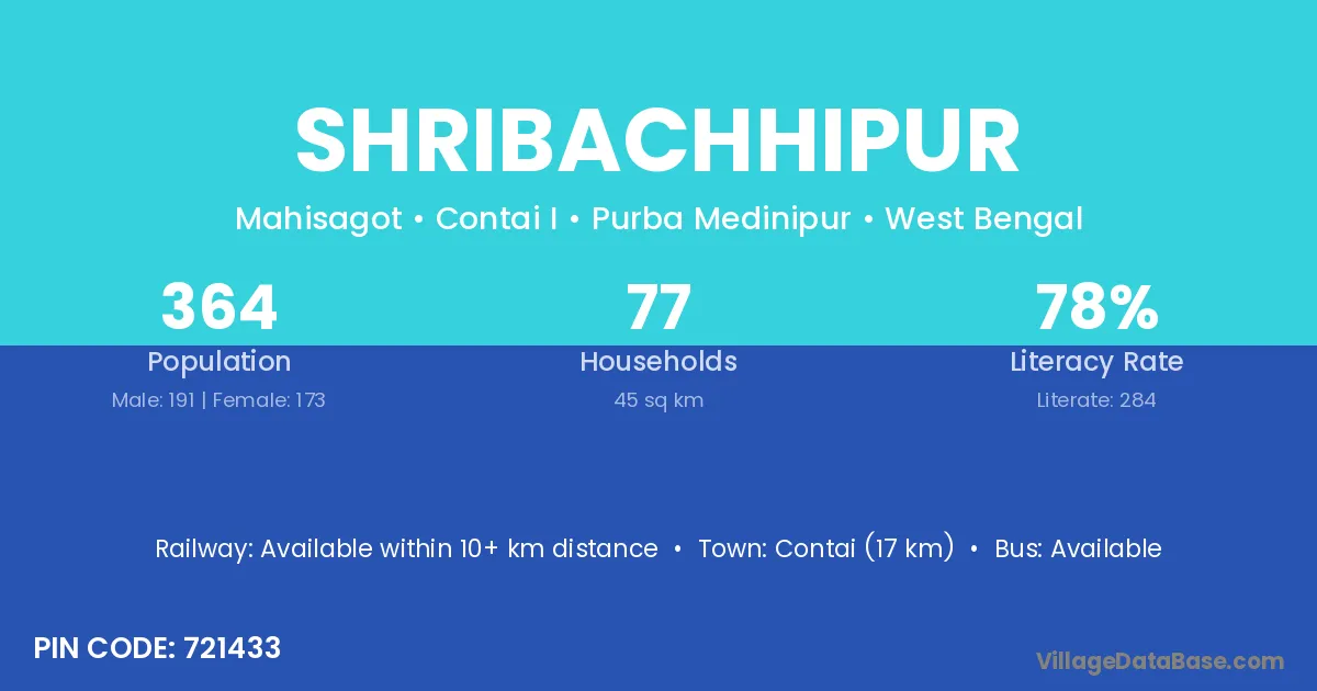 Contai (17 km) is the nearest town to Shribachhipur village for major economic activities and is located approximately 17 km away.