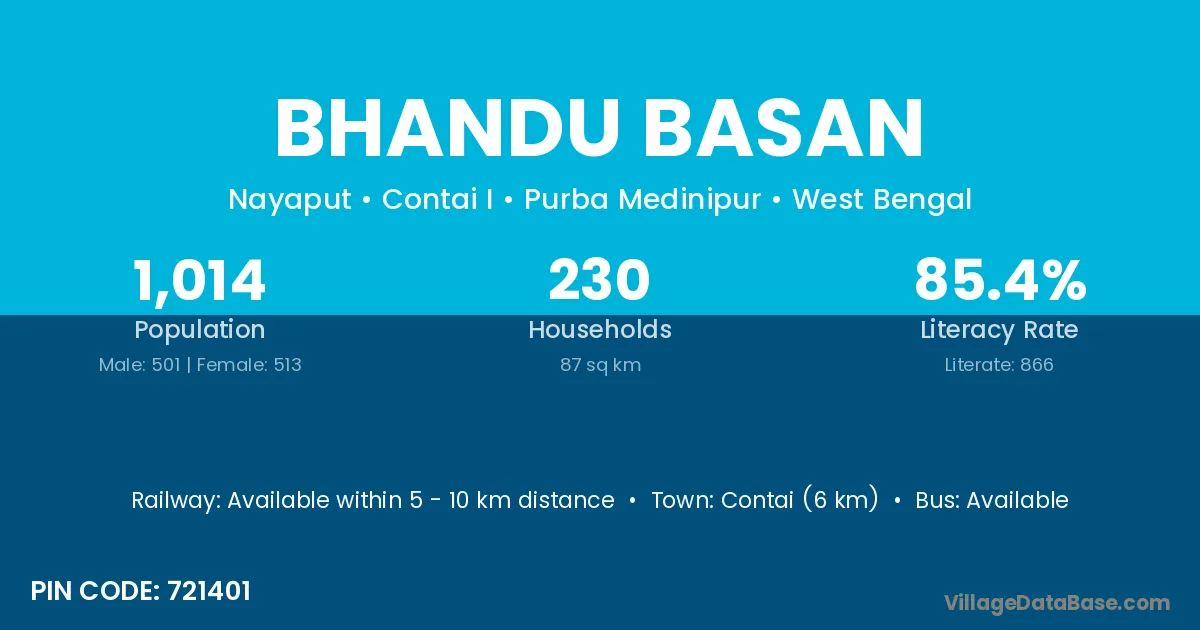 Contai (6 km) is the nearest town to Bhandu Basan village for major economic activities and is located approximately 6 km away.