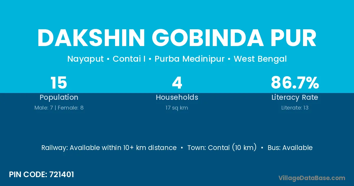 Contai (10 km) is the nearest town to Dakshin Gobinda Pur village for major economic activities and is located approximately 10 km away.
