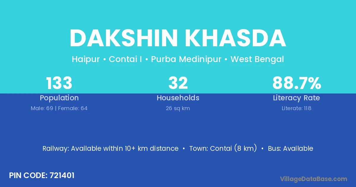Contai (8 km) is the nearest town to Dakshin Khasda village for major economic activities and is located approximately 8 km away.
