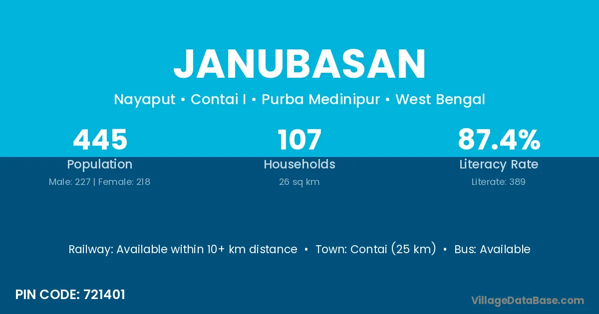 Contai (25 km) is the nearest town to Janubasan village for major economic activities and is located approximately 25 km away.
