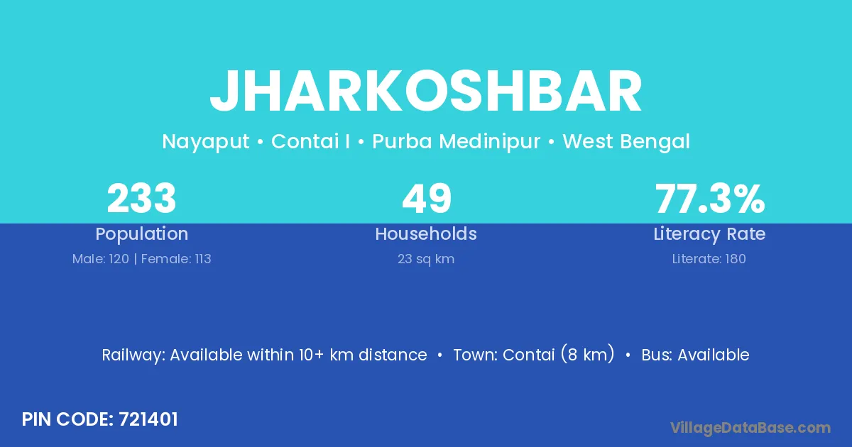 Contai (8 km) is the nearest town to Jharkoshbar village for major economic activities and is located approximately 8 km away.