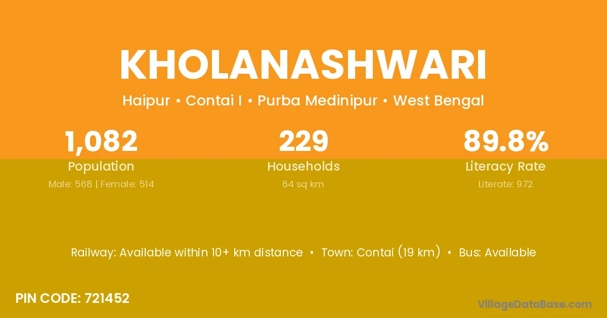 Contai (19 km) is the nearest town to Kholanashwari village for major economic activities and is located approximately 19 km away.