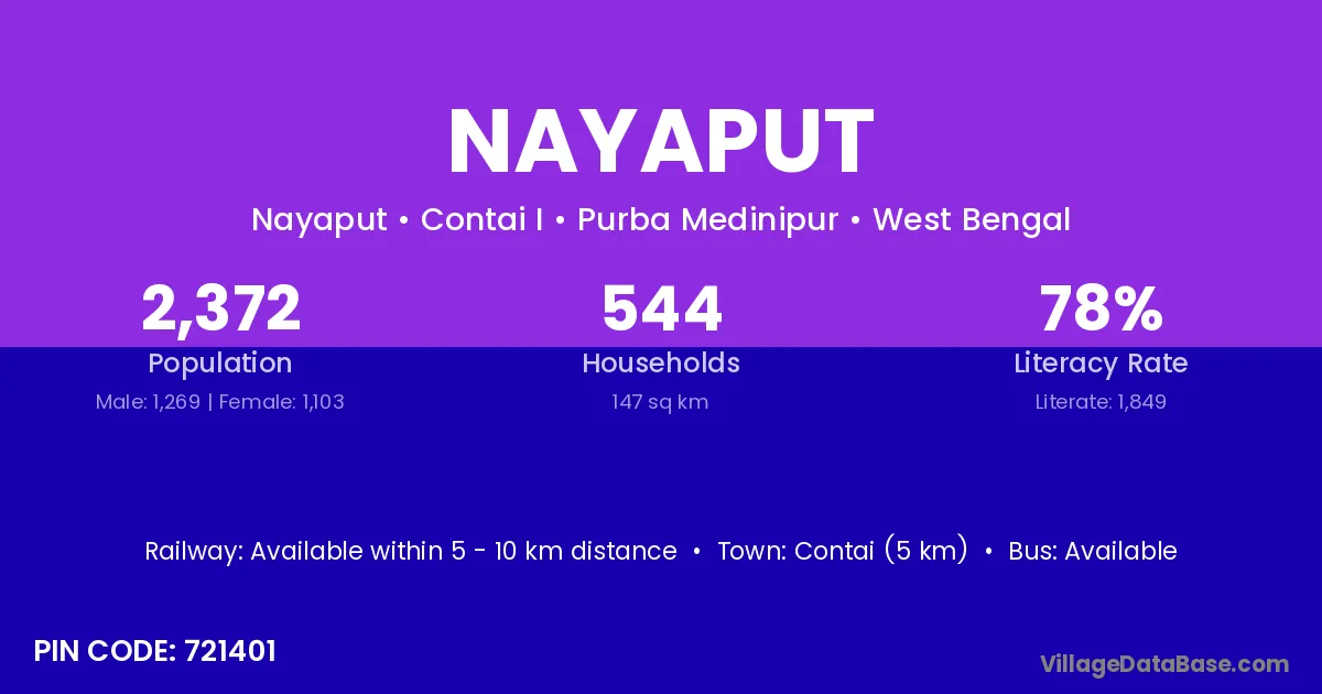 Contai (5 km) is the nearest town to Nayaput village for major economic activities and is located approximately 5 km away.