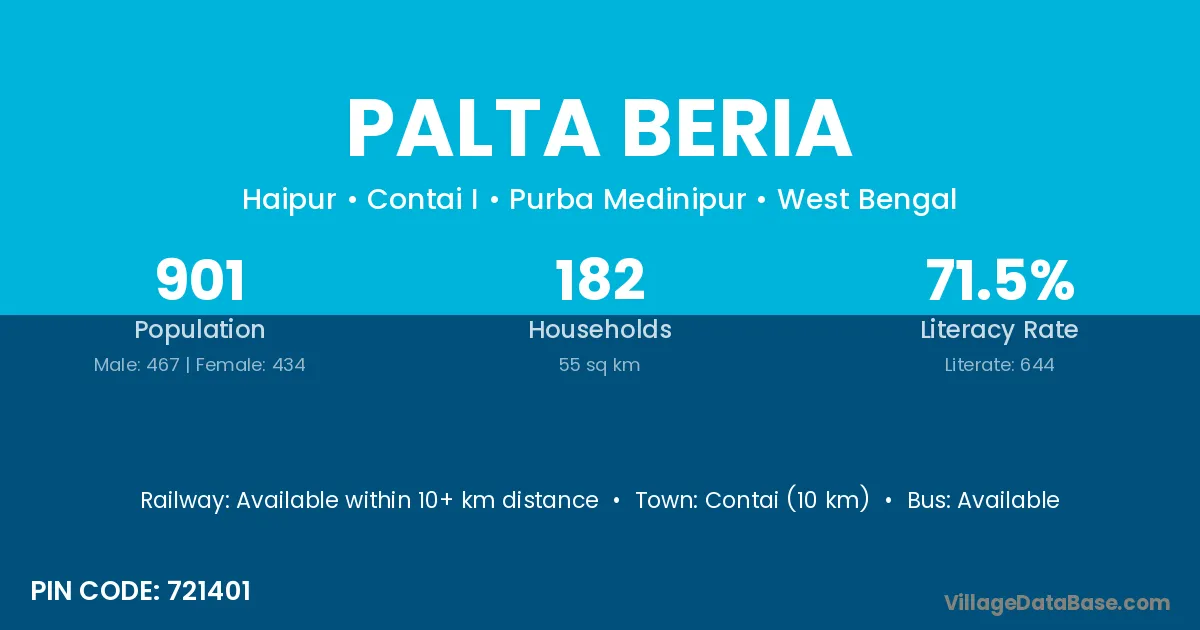 Contai (10 km) is the nearest town to Palta Beria village for major economic activities and is located approximately 10 km away.