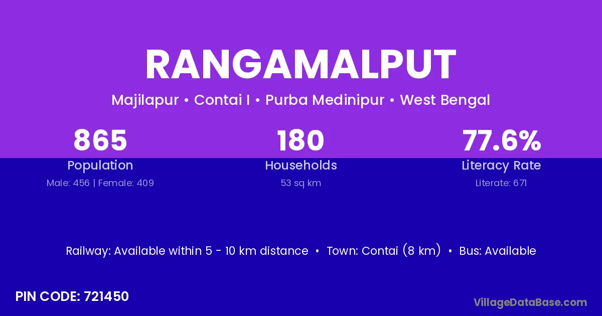 Contai (8 km) is the nearest town to Rangamalput village for major economic activities and is located approximately 8 km away.
