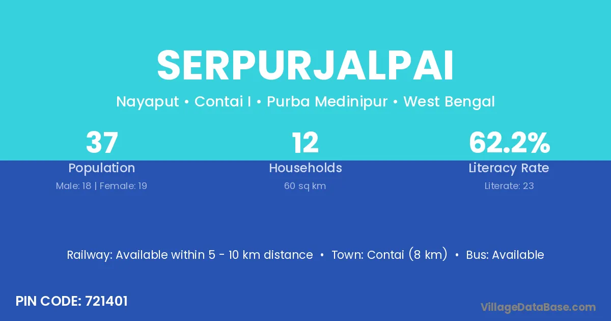Contai (8 km) is the nearest town to Serpurjalpai village for major economic activities and is located approximately 8 km away.