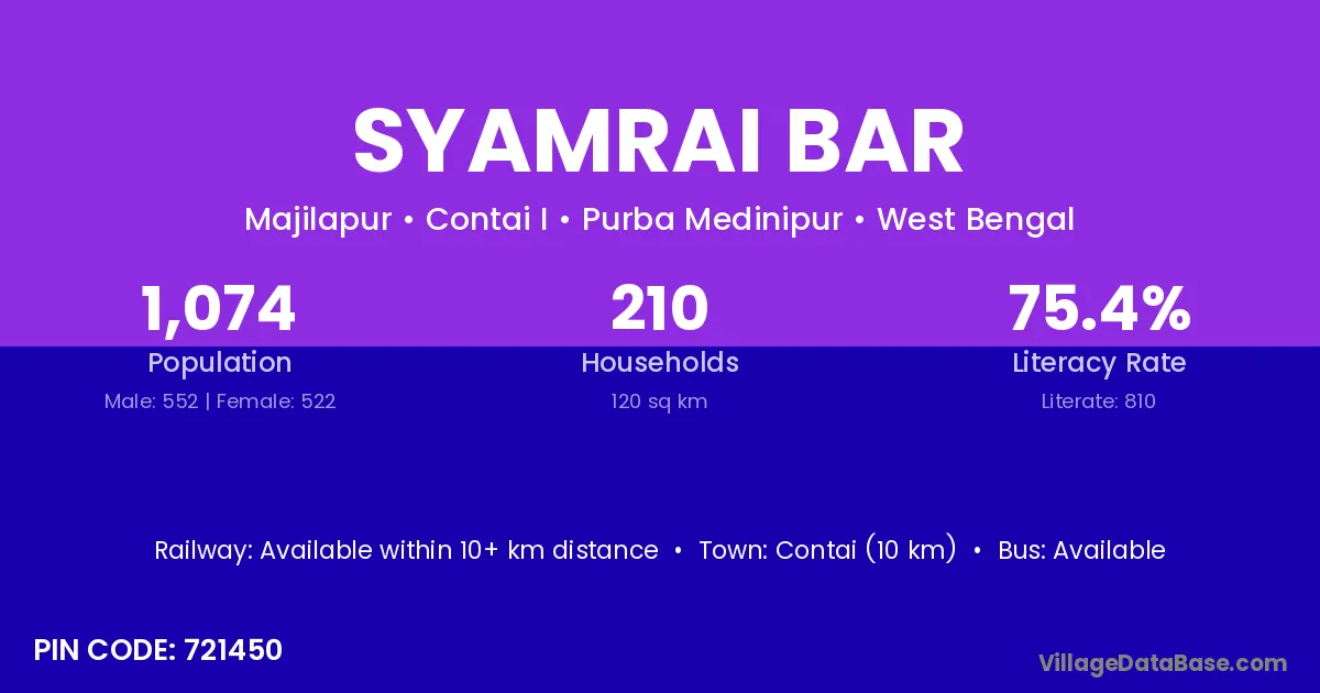 Contai (10 km) is the nearest town to Syamrai Bar village for major economic activities and is located approximately 10 km away.