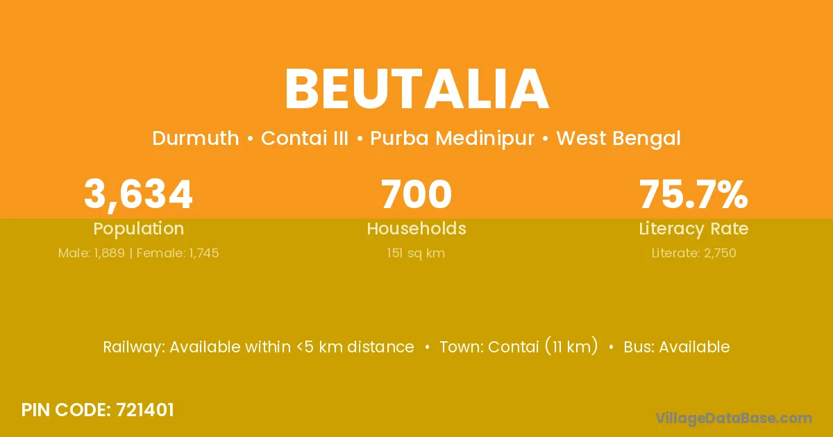 Contai (11 km) is the nearest town to Beutalia village for major economic activities and is located approximately 11 km away.