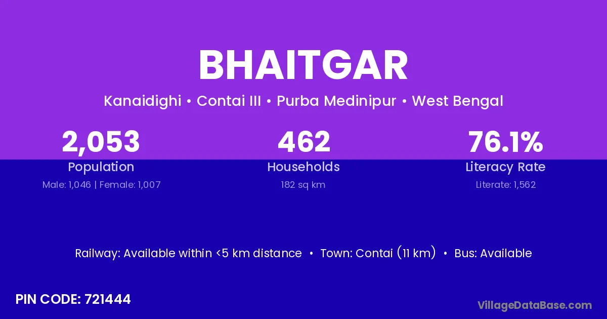 Contai (11 km) is the nearest town to Bhaitgar village for major economic activities and is located approximately 11 km away.