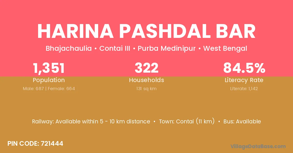 Contai (11 km) is the nearest town to Harina Pashdal Bar village for major economic activities and is located approximately 11 km away.