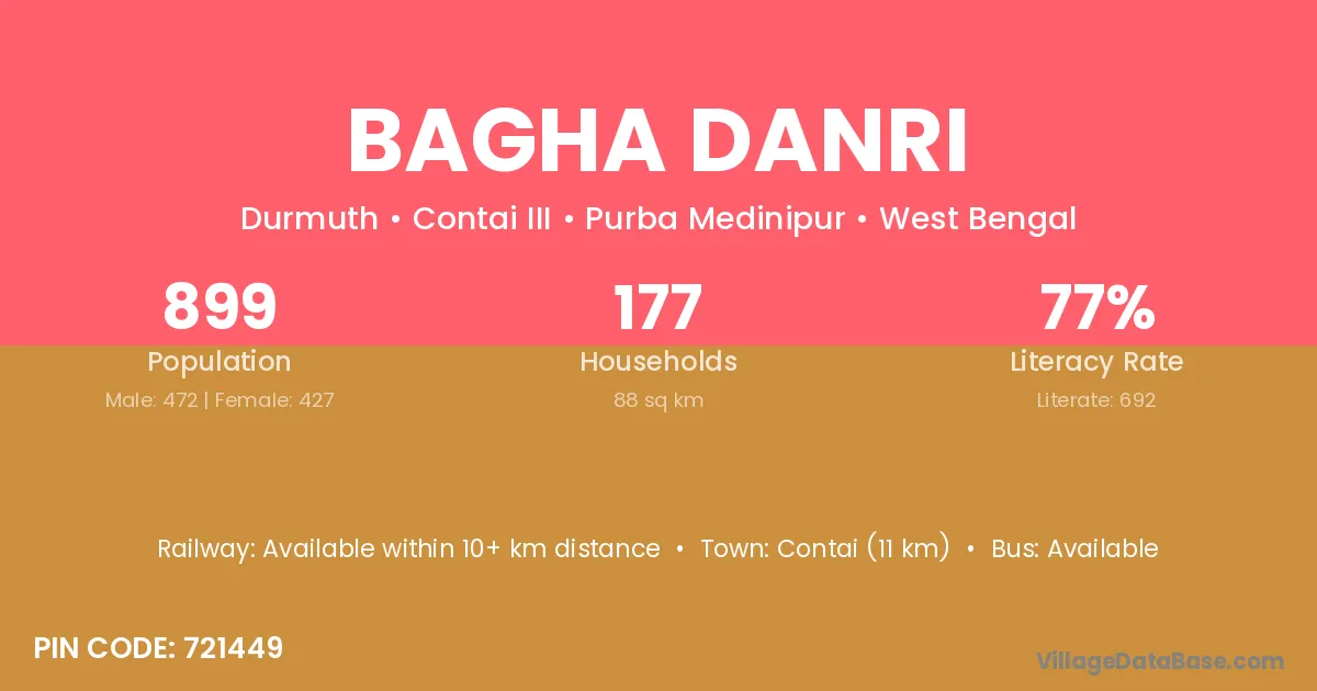 Contai (11 km) is the nearest town to Bagha Danri village for major economic activities and is located approximately 11 km away.