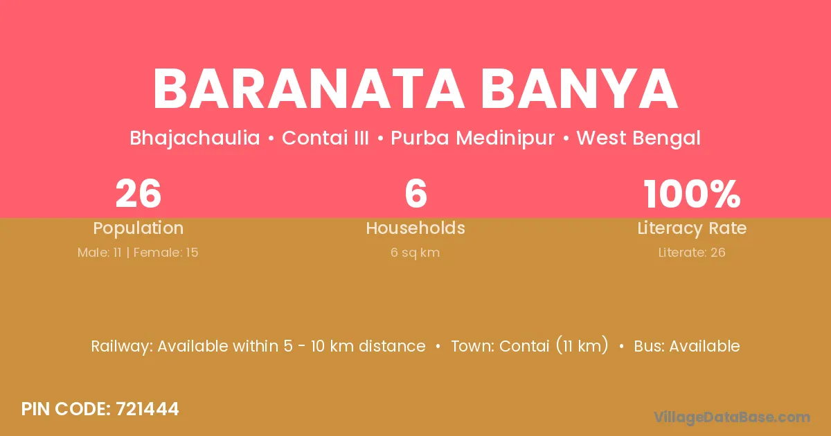 Contai (11 km) is the nearest town to Baranata Banya village for major economic activities and is located approximately 11 km away.