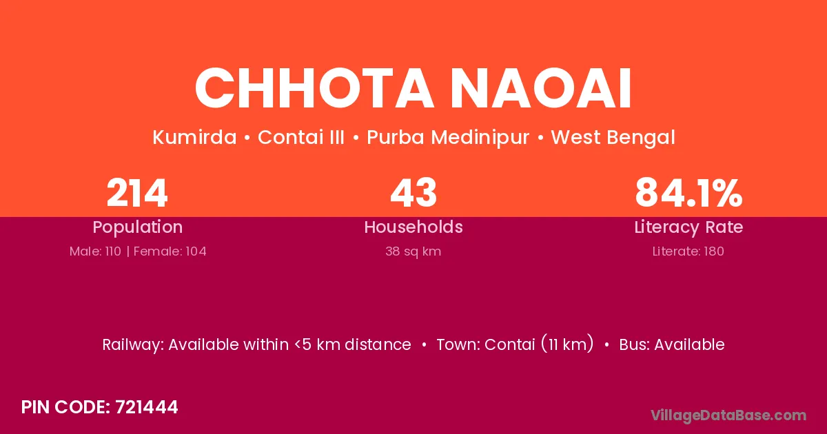 Contai (11 km) is the nearest town to Chhota Naoai village for major economic activities and is located approximately 11 km away.