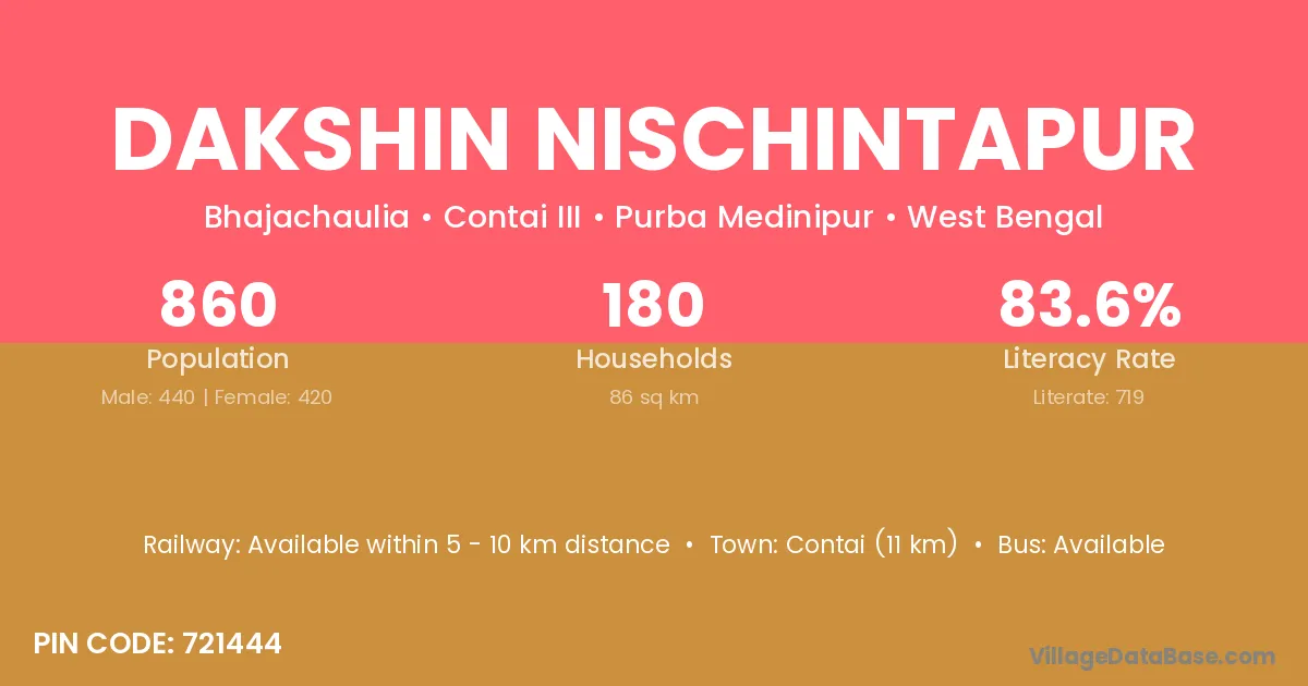 Contai (11 km) is the nearest town to Dakshin Nischintapur village for major economic activities and is located approximately 11 km away.