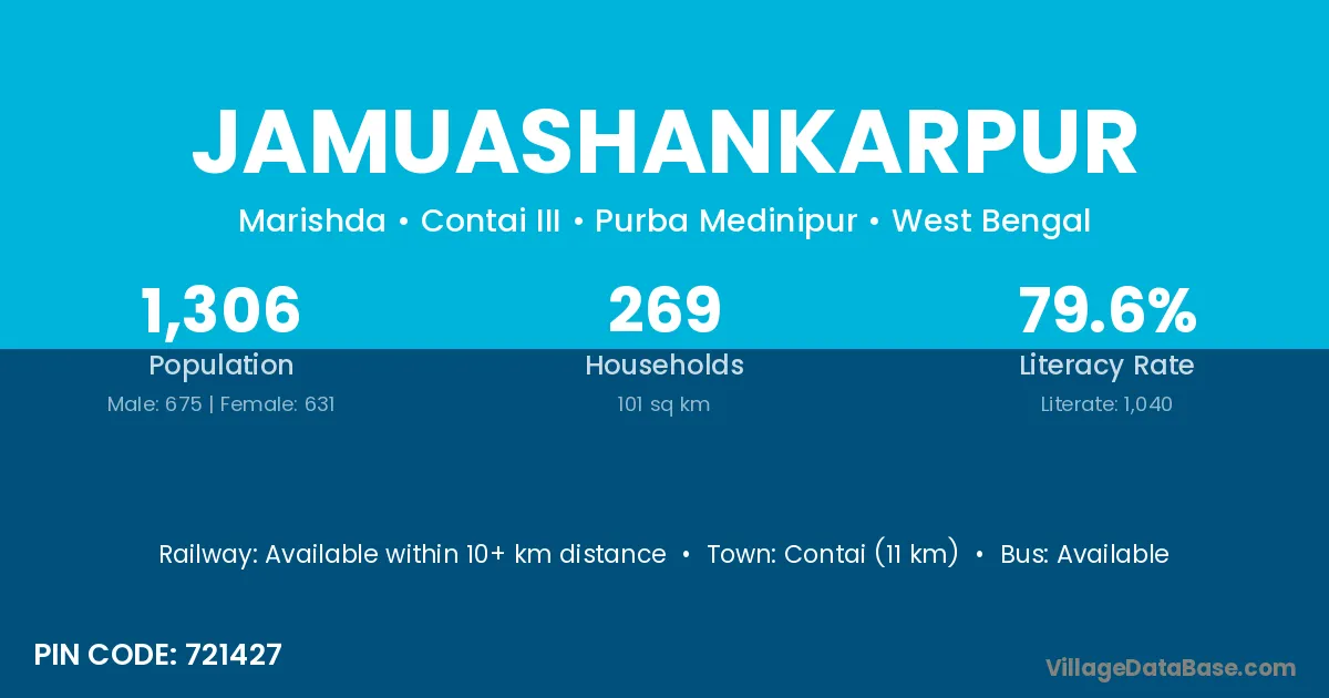 Contai (11 km) is the nearest town to Jamuashankarpur village for major economic activities and is located approximately 11 km away.