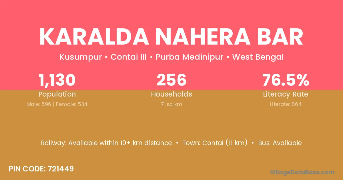 Contai (11 km) is the nearest town to Karalda Nahera Bar village for major economic activities and is located approximately 11 km away.