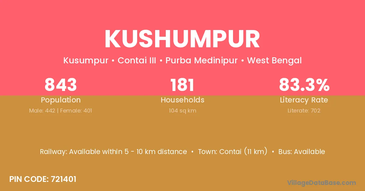 Contai (11 km) is the nearest town to Kushumpur village for major economic activities and is located approximately 11 km away.
