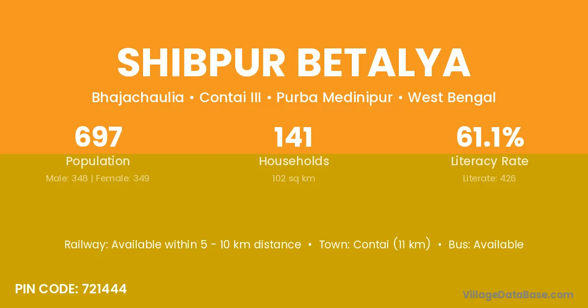 Contai (11 km) is the nearest town to Shibpur Betalya village for major economic activities and is located approximately 11 km away.