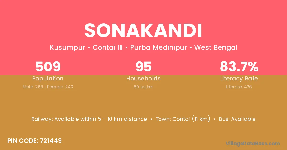 Contai (11 km) is the nearest town to Sonakandi village for major economic activities and is located approximately 11 km away.