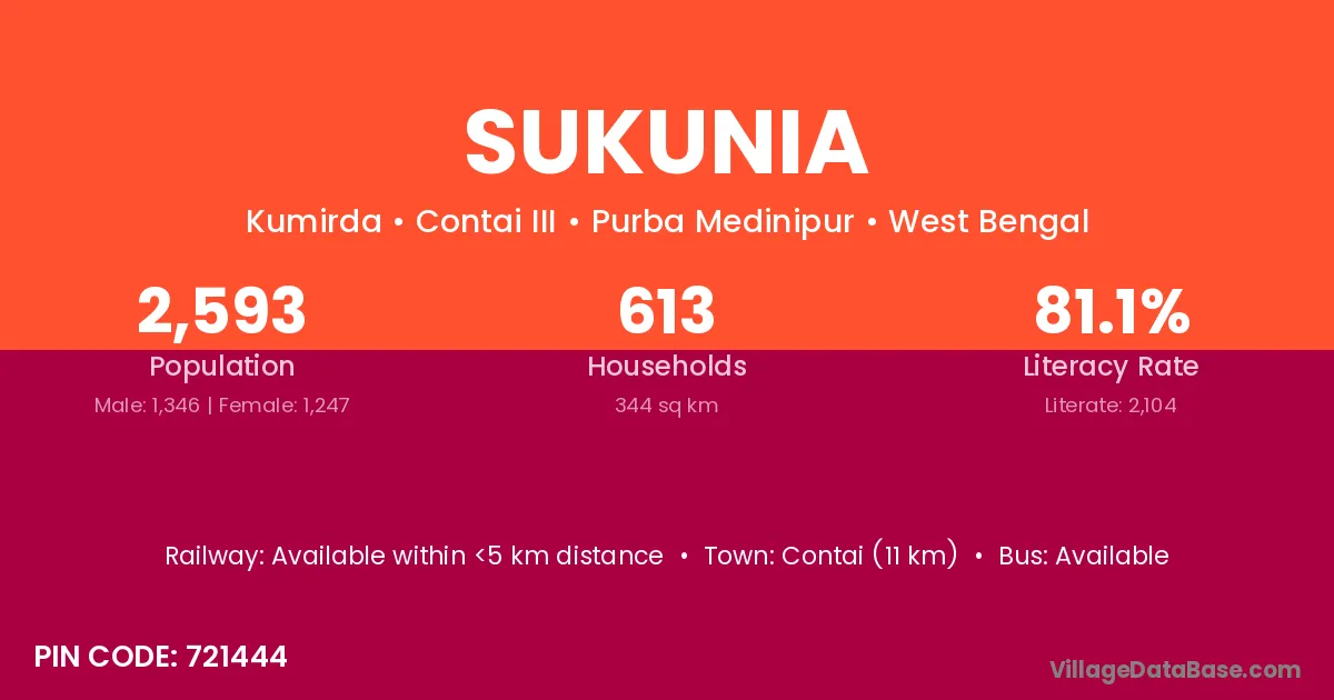 Contai (11 km) is the nearest town to Sukunia village for major economic activities and is located approximately 11 km away.