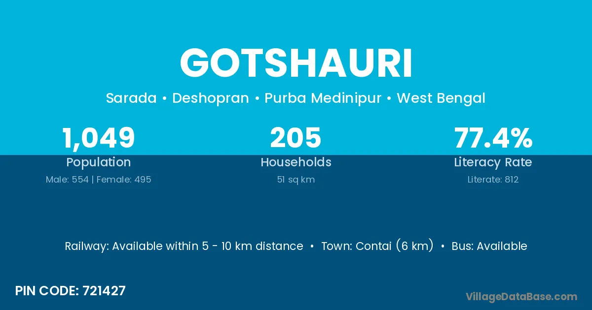 Contai (6 km) is the nearest town to Gotshauri village for major economic activities and is located approximately 6 km away.