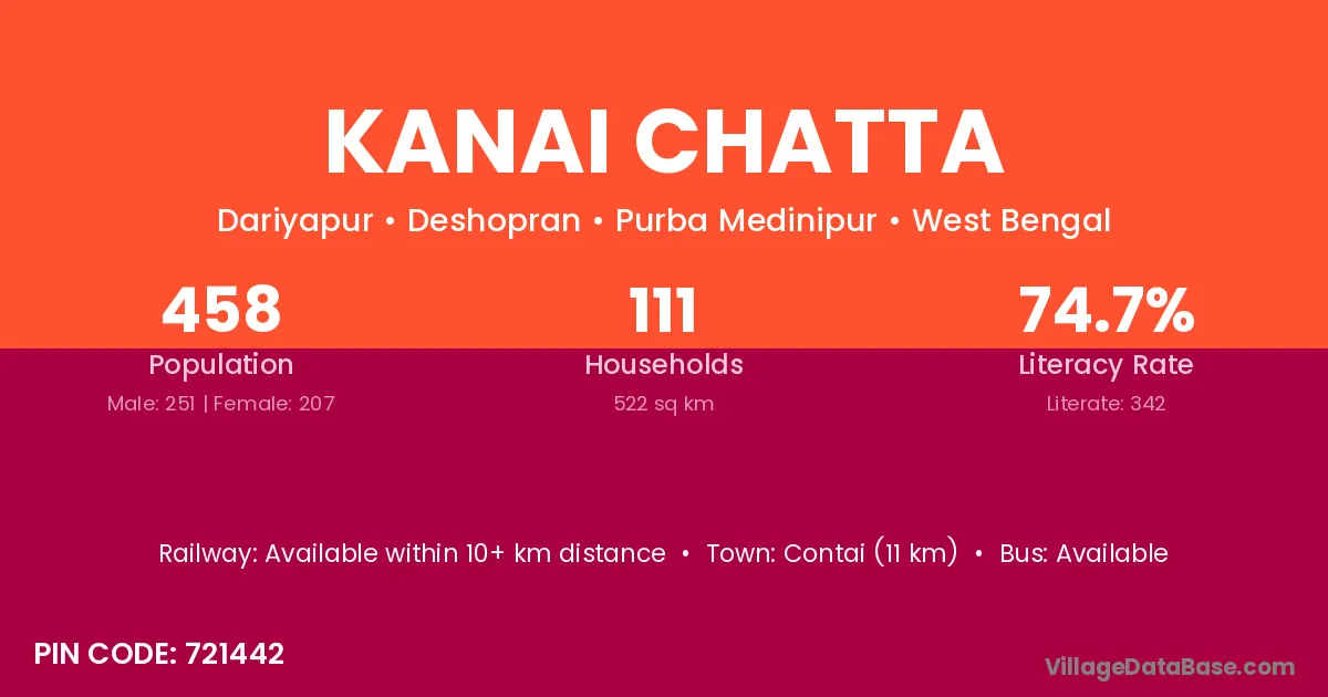 Contai (11 km) is the nearest town to Kanai Chatta village for major economic activities and is located approximately 11 km away.