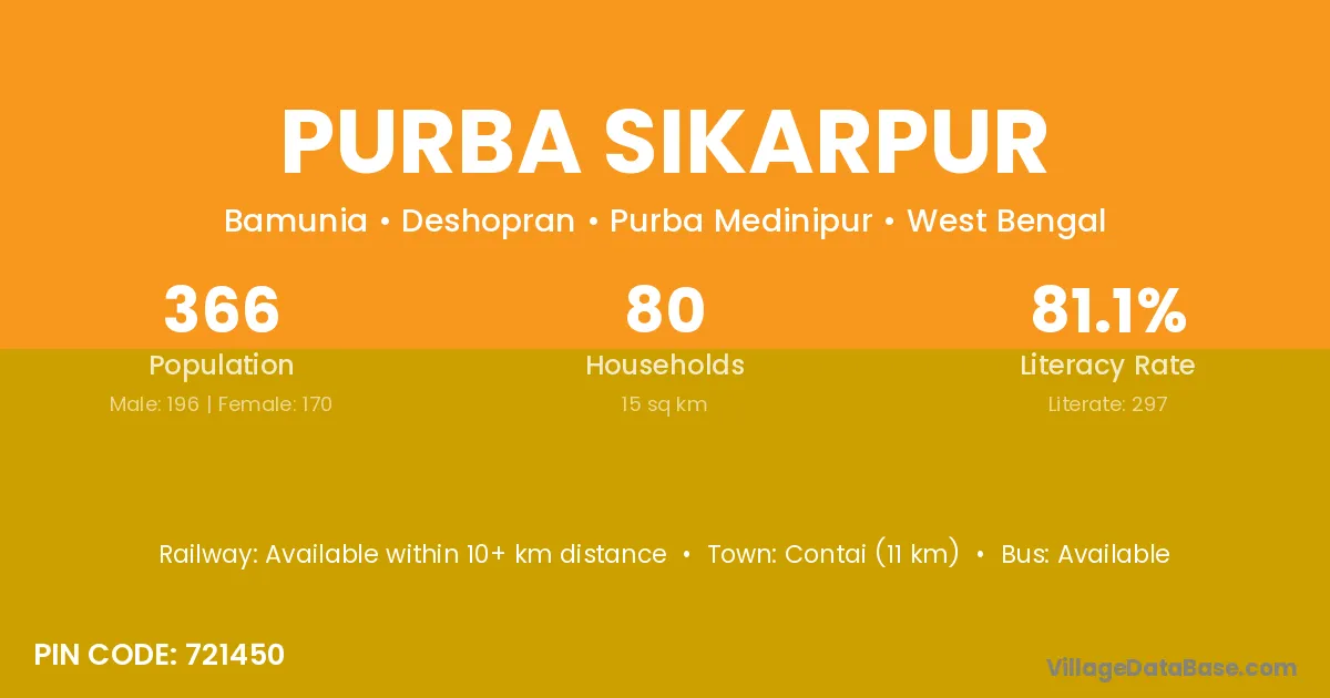 Contai (11 km) is the nearest town to Purba Sikarpur village for major economic activities and is located approximately 11 km away.