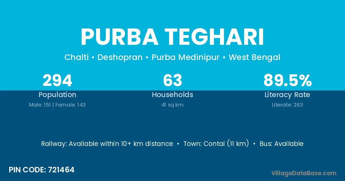 Contai (11 km) is the nearest town to Purba Teghari village for major economic activities and is located approximately 11 km away.
