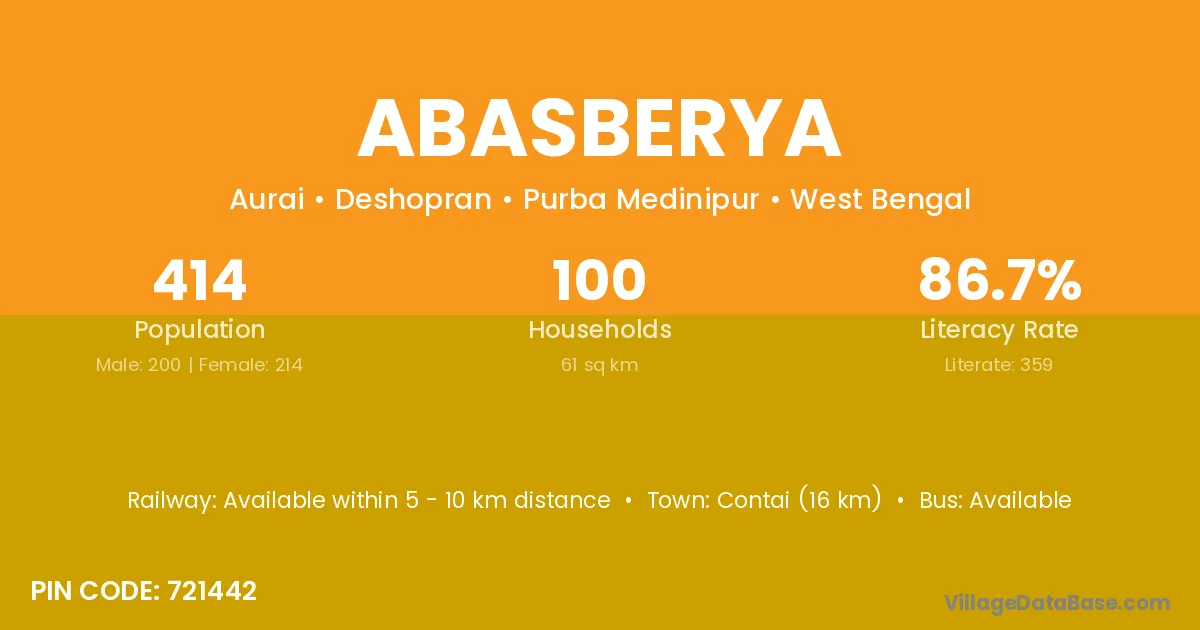 Contai (16 km) is the nearest town to Abasberya village for major economic activities and is located approximately 16 km away.