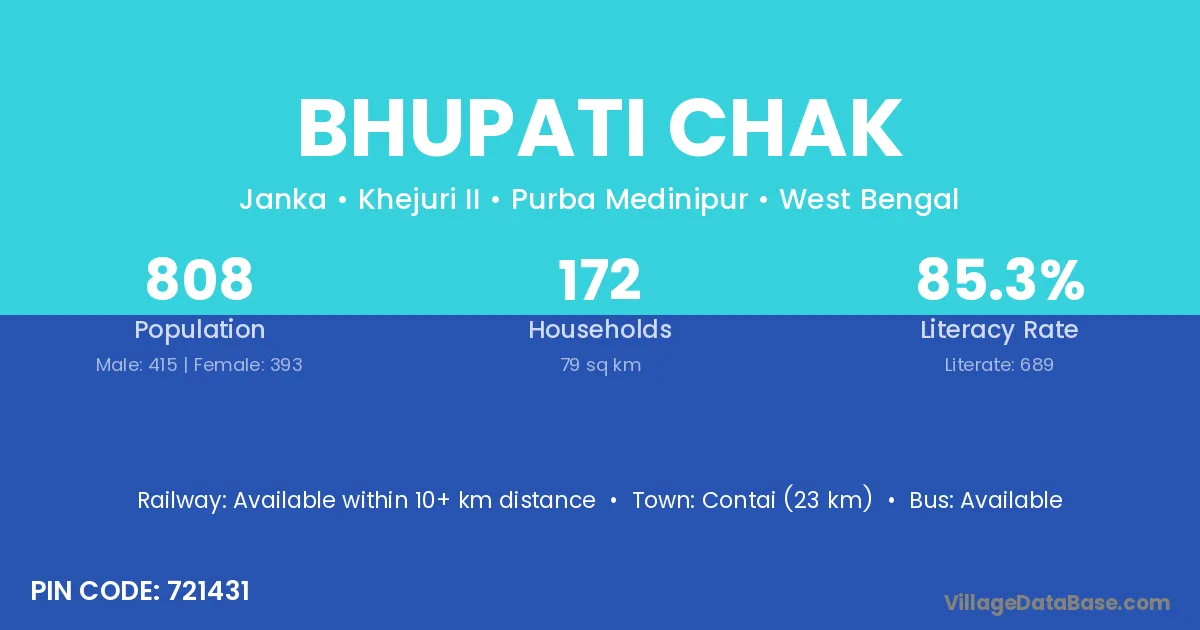 Contai (11 km) is the nearest town to Bhupati Chak village for major economic activities and is located approximately 11 km away.
