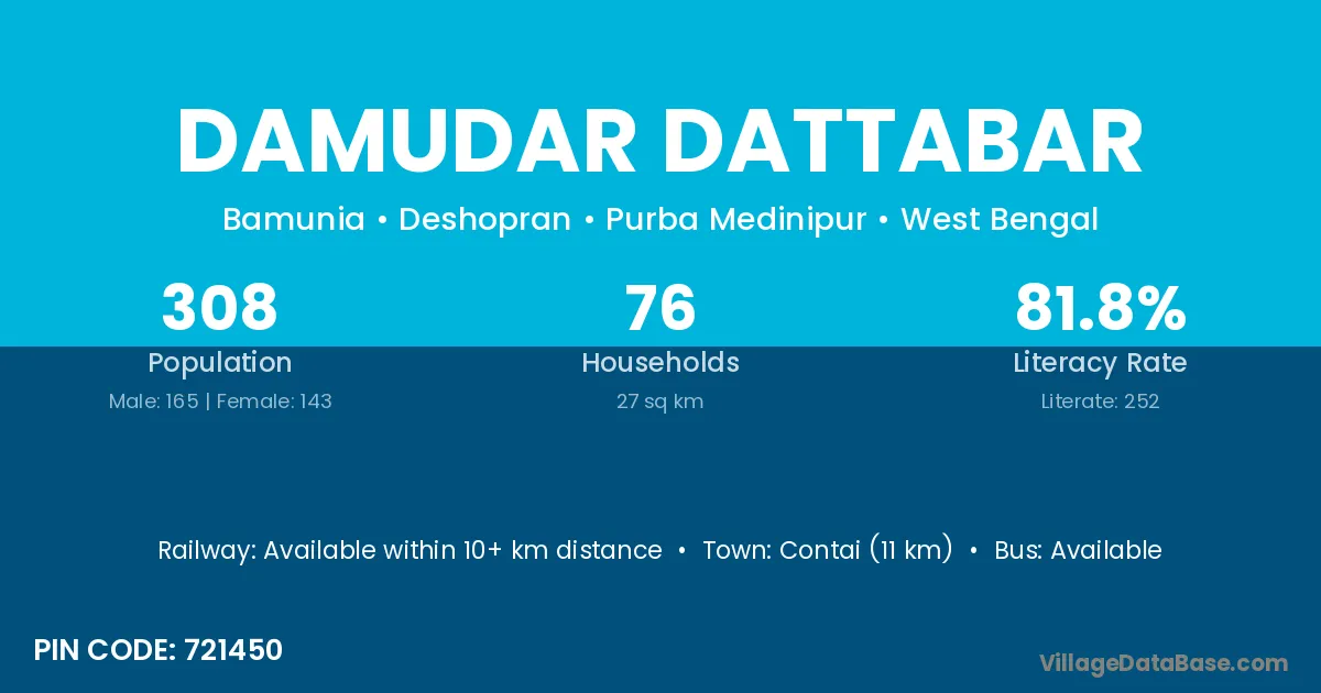 Contai (11 km) is the nearest town to Damudar Dattabar village for major economic activities and is located approximately 11 km away.