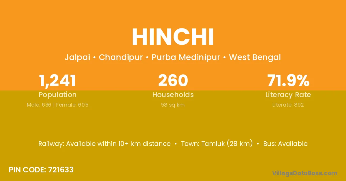 Contai (4 km) is the nearest town to Hinchi village for major economic activities and is located approximately 4 km away.